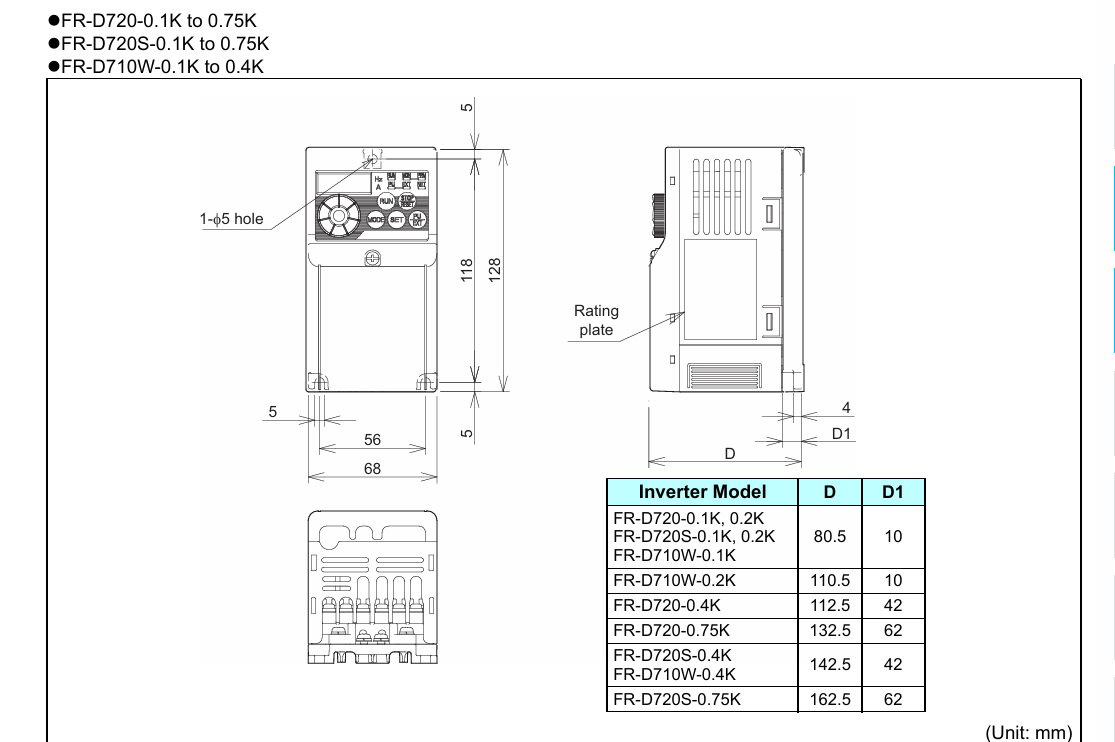 | FR-D720S-0.75k | 0.75 | 1.7 | 1.2 | 2.3 | 1.1 | 68*128*162.5 | |