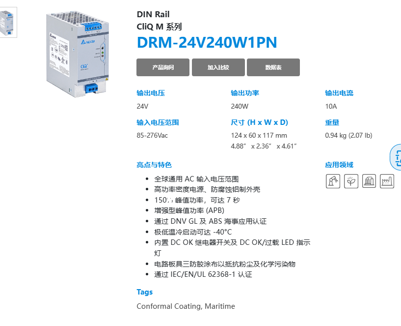 AC 輸入電壓范圍 高功率密度電源、防腐蝕鋁制外殼 150 峰值功率,可達 7 秒 增強型峰值功率 (APB) 通過 DNV GL 及 ABS 海事應用認證 極低溫冷啟動可達 -40°C 內置 DC OK 繼電器開關及 DC OK/過載 LED 指示燈 電路板具三防膠涂布以抵抗粉塵及化學污染物 通過 IEC/EN/UL 62368-1 認證