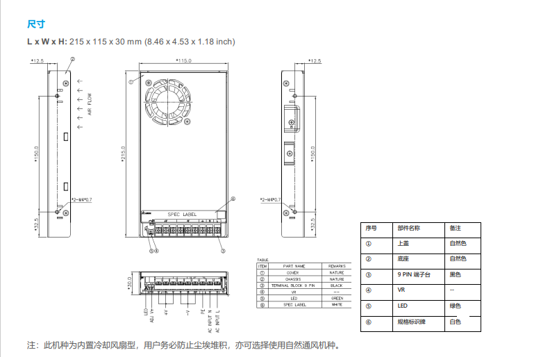 尺寸(L×W×H) mm 215×115×30 215×115×30 215×115×30 215×115×30