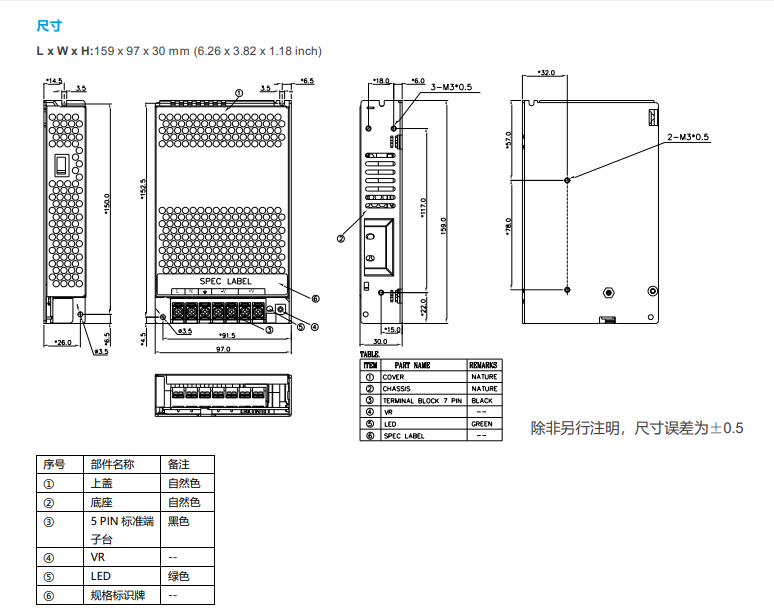 尺寸(L × W × H) mm 99 × 82 × 29 99 × 82 × 29 99 × 97 × 30 129 × 97 × 30 159 × 97 × 30 159 × 97 × 30