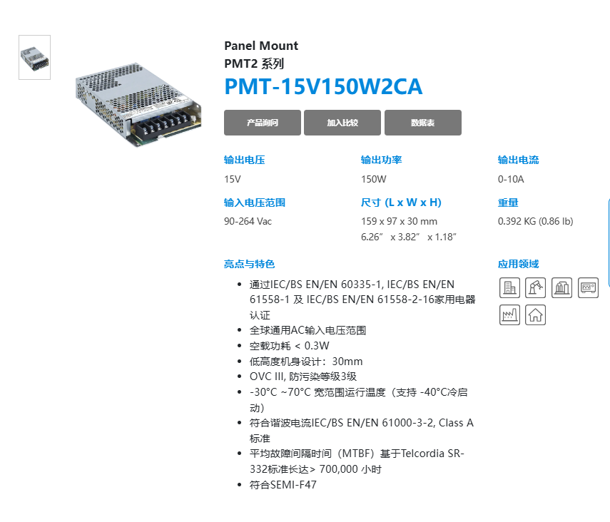 | 輸出 | PMT-15V35W2BA | PMT-15V50W2BA | PMT-15V75W2BA | PMT-15V100W2BA | PMT-15V150W2BA | PMT-15V150W2CA | |