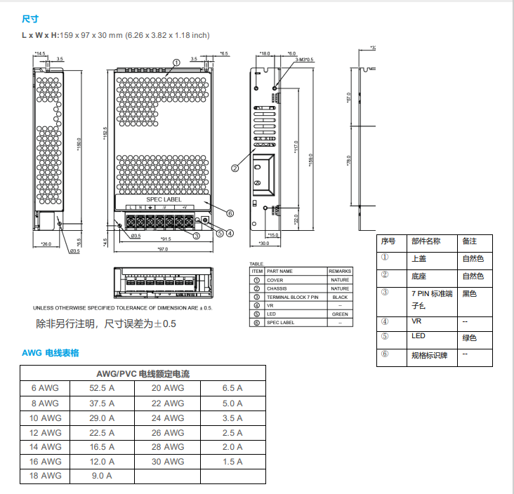 | 尺寸(L × W × H) | mm | 99 × 82 × 29 | 99 × 82 × 29 | 99 × 97 × 30 | 129 × 97 × 30 | 159 × 97 × 30 | 159 × 97 × 30 |